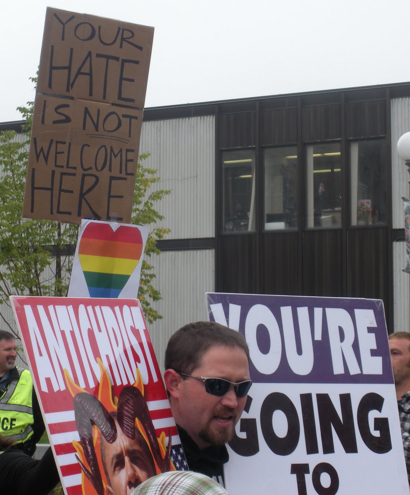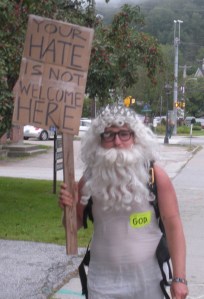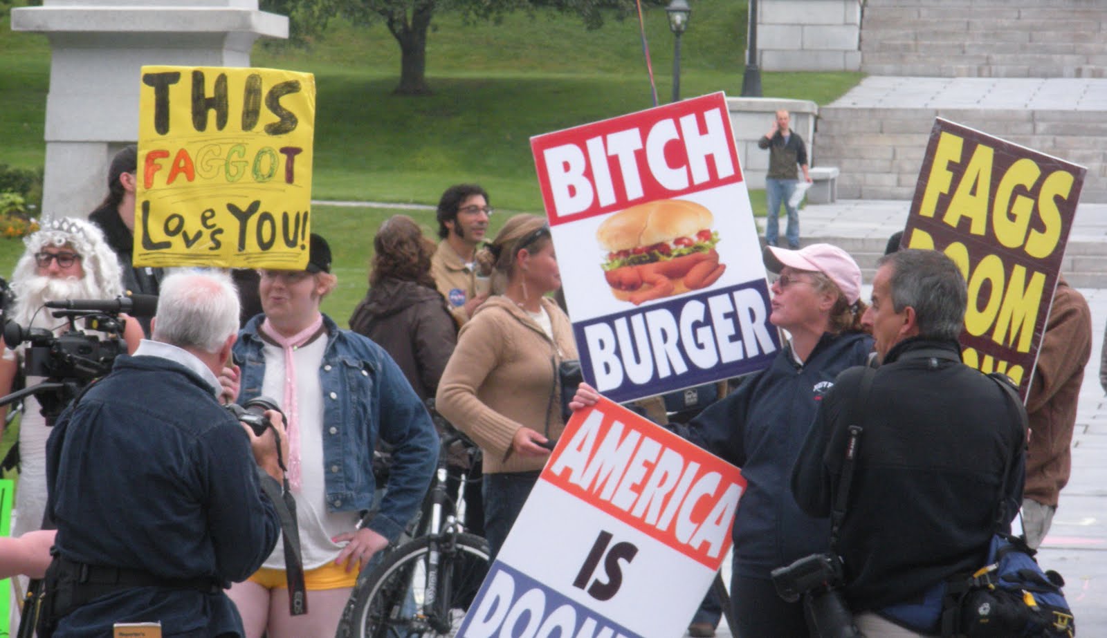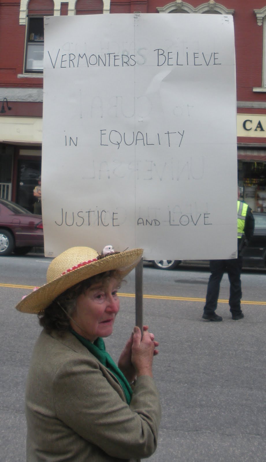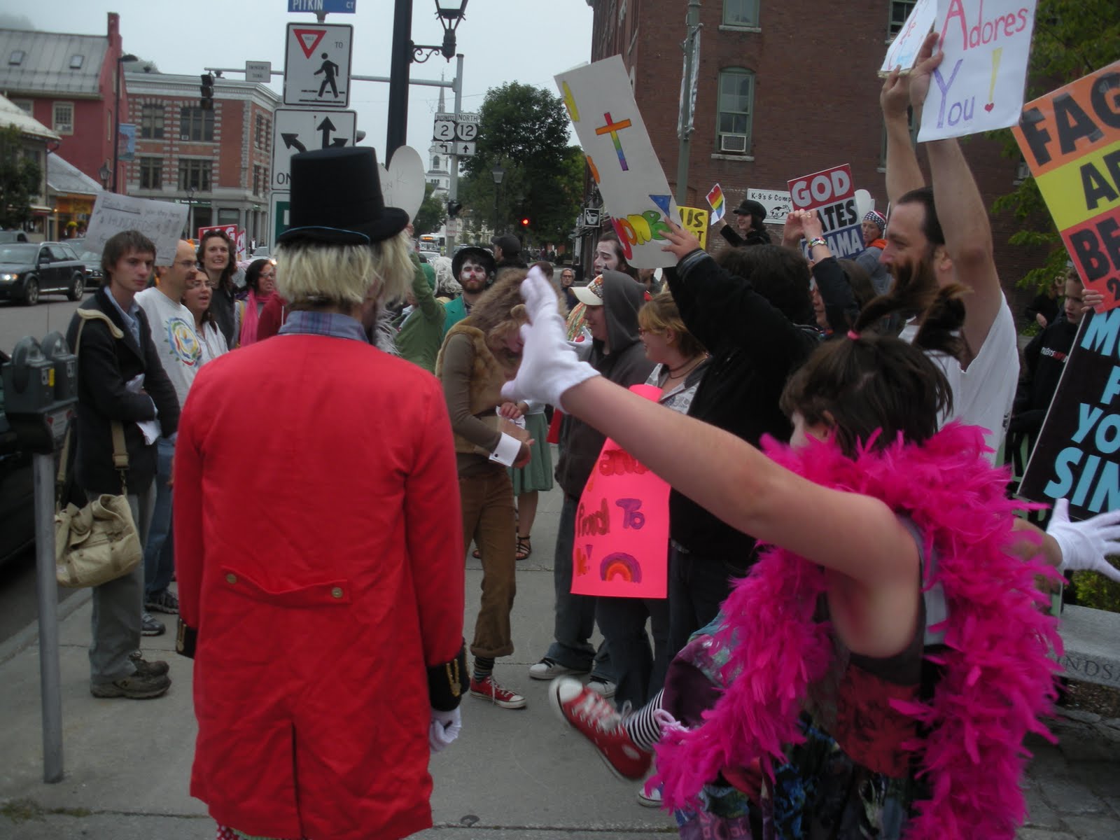 For obvious reasons, this encounter was on my mind yesterday morning when a small group of extreme protesters (or, to be fair, “protesters who some have deemed to be extreme”) visited Vermont to protest gay marriage as well as, it seemed to this biased observer, everything else. They were doing so on behalf of God. I’m not making that up. One of the women in the group said, “you’re darn tootin’ we’re a hate group. We’re preaching the hatred of God.” I can’t begin to imagine what makes these people tick; how one goes about justifying such a message. What I can state with full confidence, though, is that the majority of Vermonters disagree. And disagree they did.